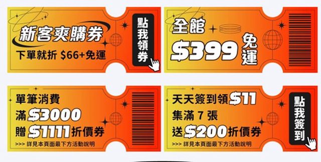 1.滿千折百(滿1000送100購物金 以此類推、無上限)