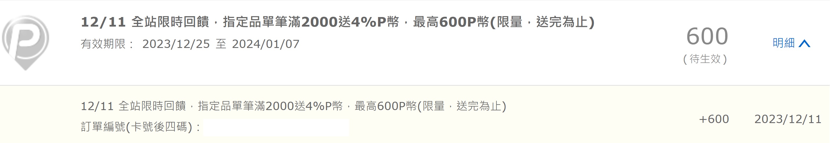 推 wewe1026: 21:25下單 5分鐘後P幣回饋就出現了 114.42.81.50 12/11 21:39