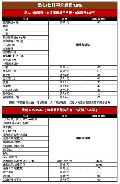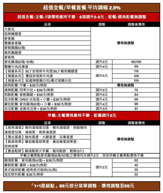 麥當勞宣布喊漲!8主餐全變貴了 最新價格表出爐 記者蕭筠/台北報導 連漲3年!人氣速食品牌「麥當勞」漲聲再響,12月20日0時起將調整菜單與部分產品價格, 其中,主餐單點價格調漲8項,漲幅最高5元,配餐部分最多也貴6元,而點心飲料類中像是 麥脆雞腿、台灣鮮榨柳丁汁漲最多達6元,平均調幅約2.4%。 https://i.imgur.com/YZwojlN.jpg