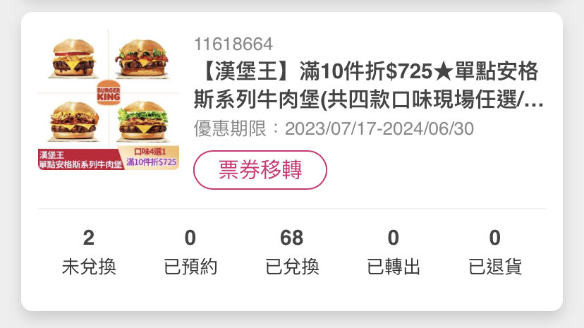Ron51320: 蝦皮漢堡王餐券便宜又沒期限,讚 112.78.78.121 12/14 14:55