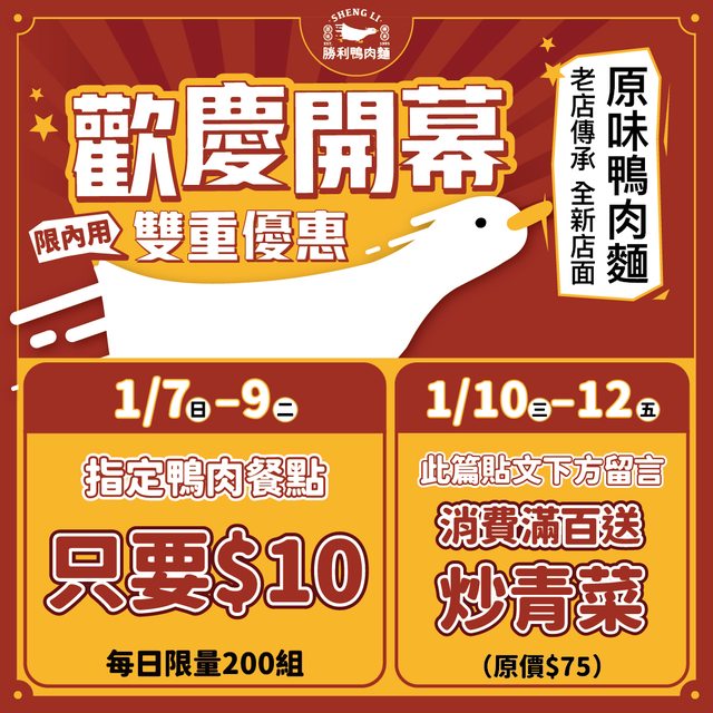 時間 : 1/7(日)~1/9(二) 地點 : 新竹市北區經國路二段224號 店名 : 勝利鴨肉麵 優惠 : 1/7(日) 人氣鴨肉飯小 $10 1/8(一) 鴨肉湯麵小 $10 1/9(二) 鴨肉湯米粉小 $10 內用限定,每日200組,售完為止。 理由 : 慶開幕 ===== https://i.imgur.com/aQWkXCR.png