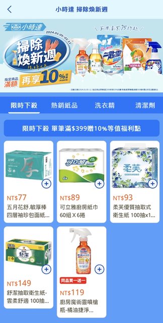 買【家清、家紙】類用品,滿399元贈送10%全聯福利點