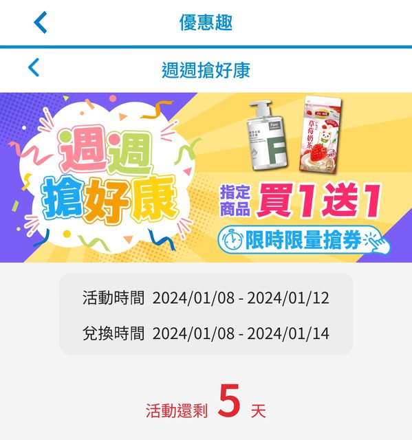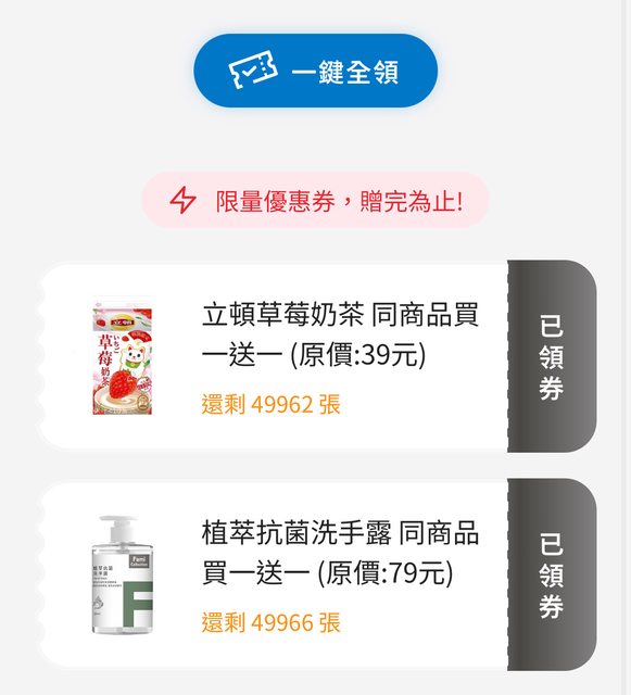 立頓草莓奶茶(原價39) 植萃抗菌洗手露(原價79) 果不其然這週也有買一送一 各位快去搶吧 草莓奶茶感覺不錯喝 -- ※ 發信站: 批踢踢實業坊(pttbestweb.org.tw), 來自: 27.53.163.94 (臺灣) ※ 文章網址: https://pttbestweb.org.tw/Lifeismoney/M.1704679634.A.216