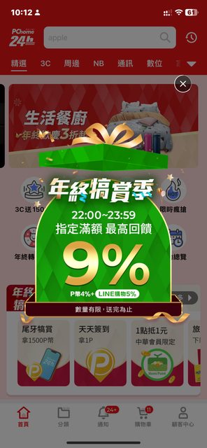 tytt: 請問今天pchome有活動嗎?看Line導購只有1% 49.216.222.160 01/11 08:14