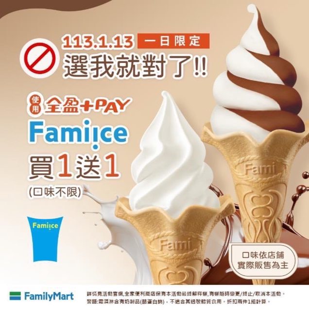 1/13號限定 結帳使用全盈配 冰淇淋買1送1 不限口味 超商社群看到的 http://i.imgur.com/oMwfuxg.jpg