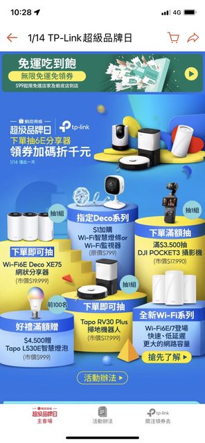 一樣限時一天,優惠整理: Archer BE550 Wi-Fi 7 路由器 $9,699 Deco XE75(3入) Wi-Fi6E Mesh路由器 $10,999 Archer AXE75 Wi-Fi6E 路由器 $3,999 Tapo C520WS 戶外旋轉攝影機 $2,299 Tapo D230S1 智慧視訊門鈴 $3,299 Tapo RV30 plus 掃地機器人 $8,599 買Deco BE85 Wi-Fi7 Mesh路由器系列送Tapo智慧感應器 還有當日折價券最高可折$1,200 蝦皮聯名卡最高20%蝦幣回饋 下單還可再抽Wi-Fi 6E XE75、Tapo RV3 https://shopee.tw/m/202401tplinksbd1 -- ※ 發信站: 批踢踢實業坊(pttbestweb.org.tw), 來自: 118.160.136.167 (臺灣) ※ 文章網址: https://pttbestweb.org.tw/Lifeismoney/M.1705201148.A.670
