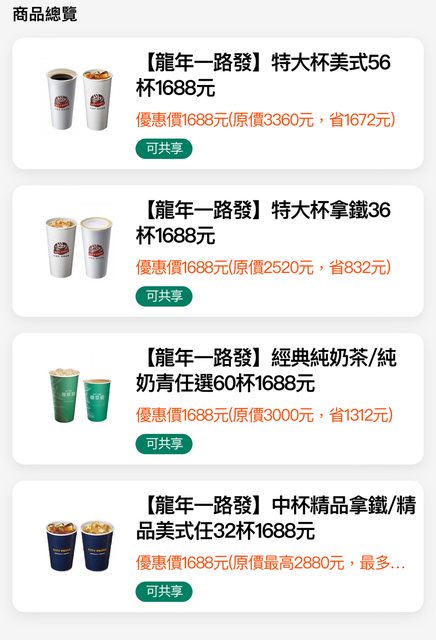 好像出來一陣子了 但沒看到有人分享 優惠到1/23 一人限購四組 兌換卷可以使用到4/30 像特大美式一杯平均31元 如果加上自帶杯折扣可以到26元 我覺得很划算 https://i.imgur.com/DpEVaiz.jpg
