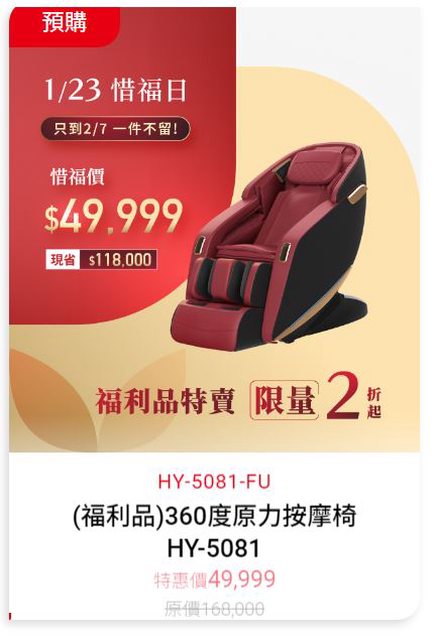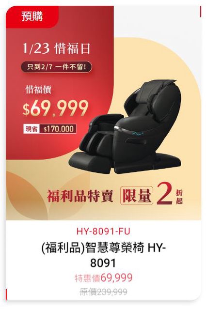 → qwe123456460: 按摩椅的福利品是退貨整新嗎,還是 203.73.34.23 01/16 13:15