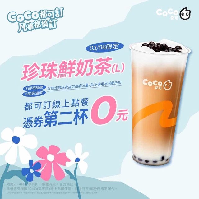 手搖小確幸來了!各大飲料店近期紛紛推出了超殺優惠。CoCo都可推出「珍珠鮮奶茶第二