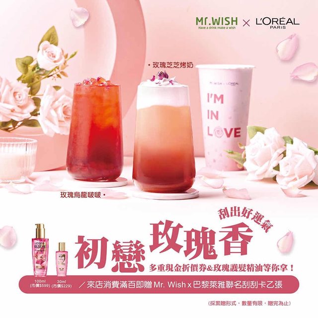 玫瑰精華30ml(市價229元共2000份),以及無數Mr.Wish飲品現金折價券和巴黎萊雅產品