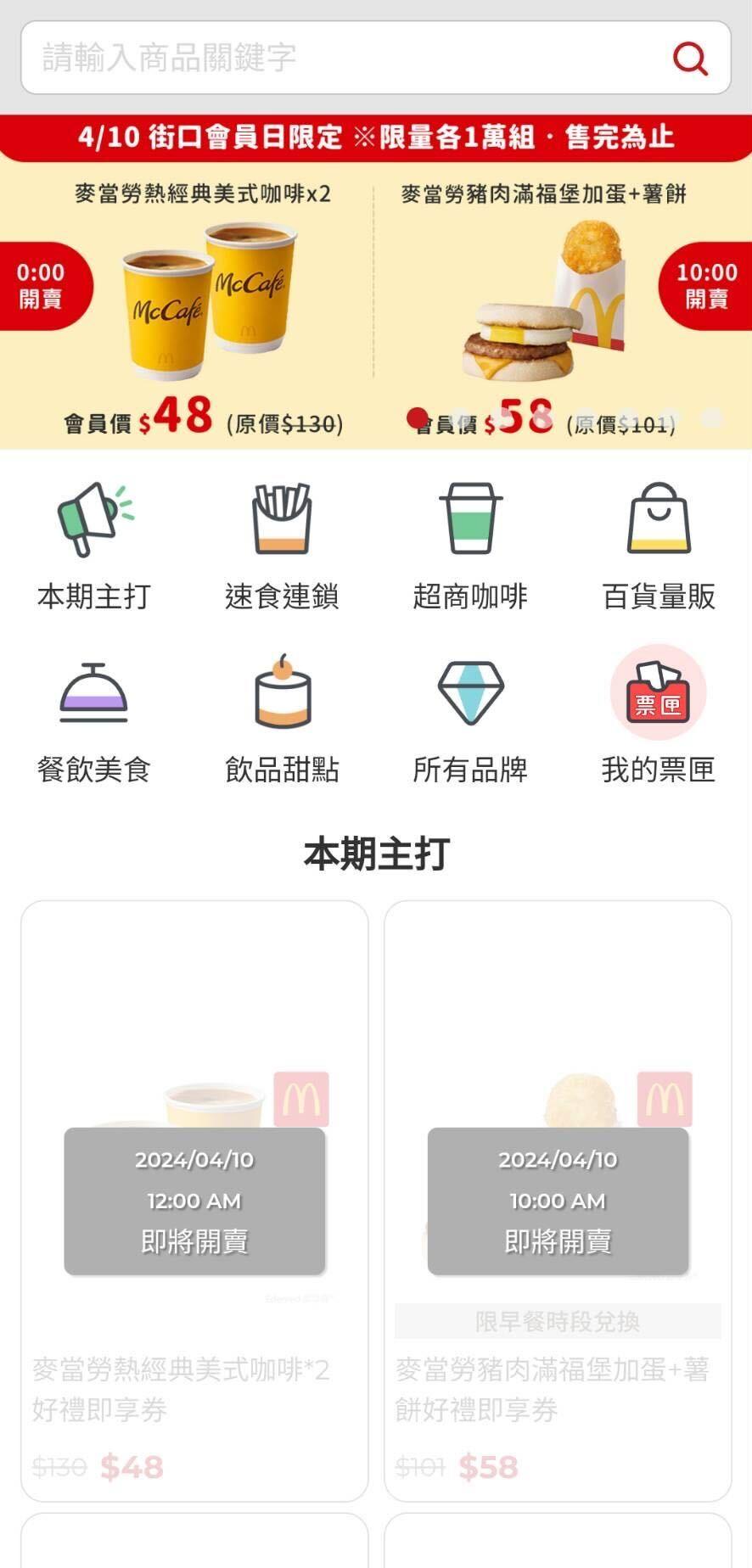 豬肉滿福堡加蛋 + 薯餅 特價 $58 熱美式買一送一 $48 是以街享券的方式購買領取兌換 不過我看還沒上架 應該是4/10當天才有可以留意 -- ※ 發信站: 批踢踢實業坊(pttbestweb.org.tw), 來自: 61.218.41.70 (臺灣) ※ 文章網址: https://pttbestweb.org.tw/Lifeismoney/M.1712632571.A.F28