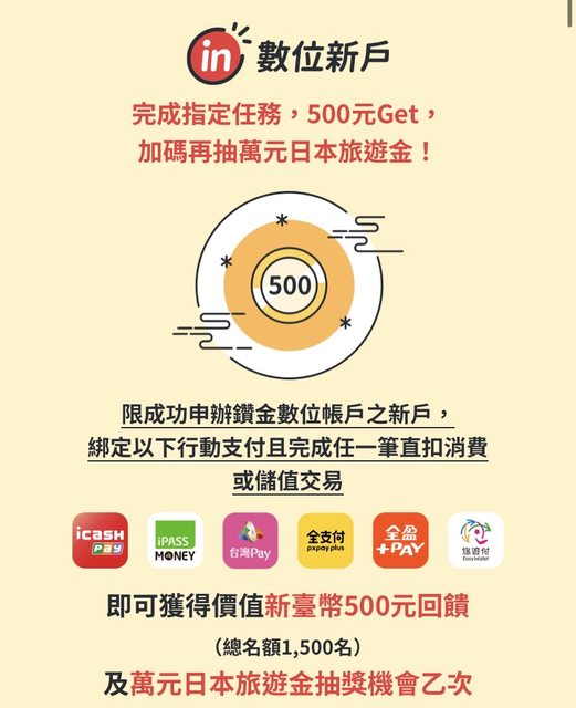 元大銀行鑽金數位新戶綁支付且完成任一筆消費直扣或儲值交易享500元回饋,還可抽萬元日本旅遊金 可綁定支付:icash Pay、iPass Money、台灣Pay、全支付、全盈+Pay及悠遊付 https://i.imgur.com/1G09qAK.jpg