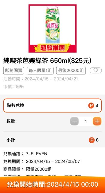OPENPOINT 4/15 凌晨0點 純喫茶芭樂綠茶 8 op 限量20000組 https://i.imgur.com/In0k92c.jpg