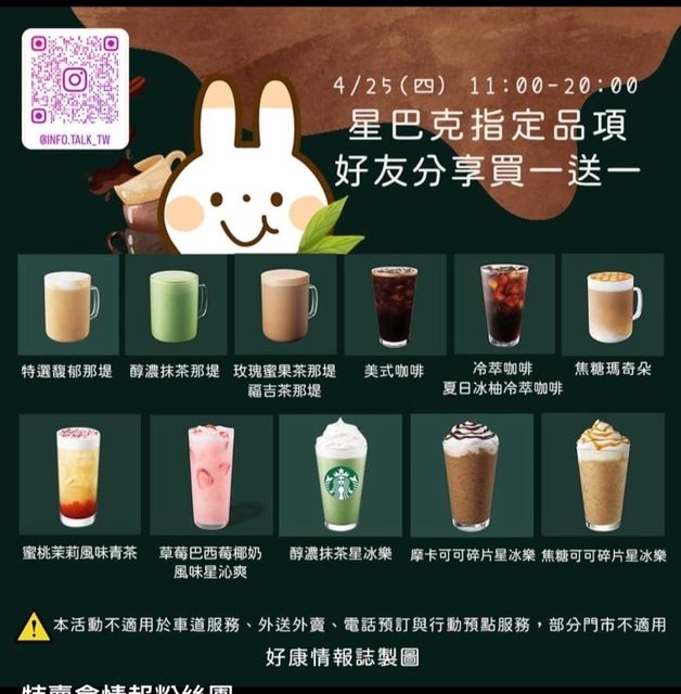 星巴克4/25「買一送一」13款咖啡飲品!3款「星冰樂爽喝半價」 天氣越來越熱!星巴克貼心放送「夏日推薦清單」優惠,一舉推出13款人氣咖啡飲品「買 一送一」! 4月25日本週四11:00-20:00,一日限定 連續9小時至全台星巴克門市,購買兩杯特大杯/冰熱/口味皆一致的指定品項飲料,其中 一杯由星巴克招待。 「夏日推薦清單」指定品項為摩卡可可碎片星冰樂、焦糖可可碎片星冰樂、醇濃抹茶星冰 樂、草莓巴西莓椰奶風味星沁爽、特選馥郁那堤、焦糖瑪奇朵、美式咖啡、冷萃咖啡、夏 日冰柚冷萃咖啡、玫瑰蜜香茶那堤、福吉茶那堤、醇濃抹茶那堤、蜜桃茉莉風味青茶。 來源: https://reurl.cc/jW8Lgy https://i.imgur.com/LbH4fzn.jpeg