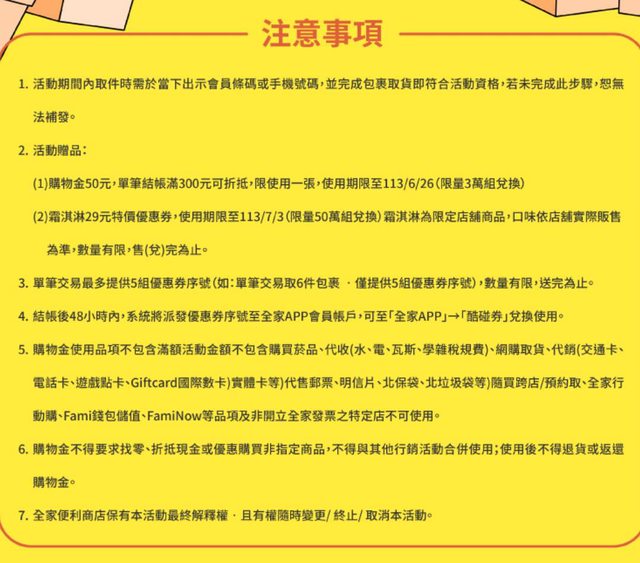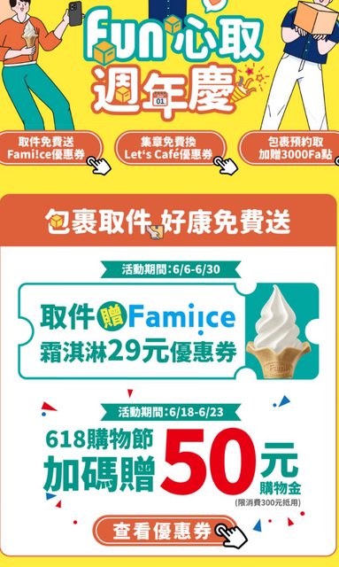 全家FUN心取 取件免費送優惠券 活動期間到全家完成包裹取件 『出示會員條碼或報手機號碼』即可拿優惠。 活動一:113/6/6-6/30享霜淇淋29元特價優惠券(限量50萬組) 活動二:113/6/18-6/23獲50元購物金頁q3萬組,消費滿300元即可折抵 每人單筆交易限贈5組兌換序號 https://i.imgur.com/EFkvp0m.jpeg