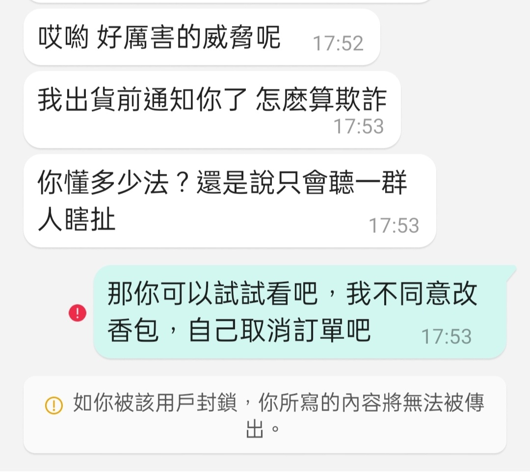 → hsh92123: 被取消是正常的,讓他被蝦皮扣分就好了 59.127.173.193 06/17 10:49