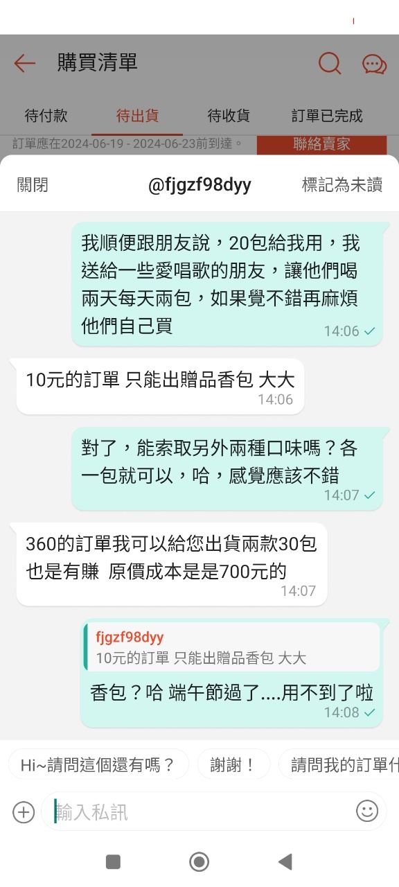 → hsh92123: 容出貨;你不回覆就代表你接受香包了 59.127.173.193 06/16 08:16