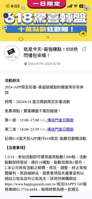 HAPPYGO有抽高額點數活動 有興趣的人可以參考看看 以下資訊提供 活動網頁: https://pse.is/63w97z 活動辦法: 參加活動即可獲得最高點數5,000點 活動點數即時發送,總計10萬點,點數效期為1個月 時間:2024/6/18 18:00~23:59 #要在APP上操作即可免費得點 https://pse.is/63um3h https://i.imgur.com/hljbCSD.jpg