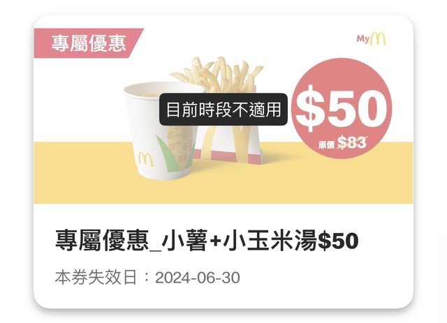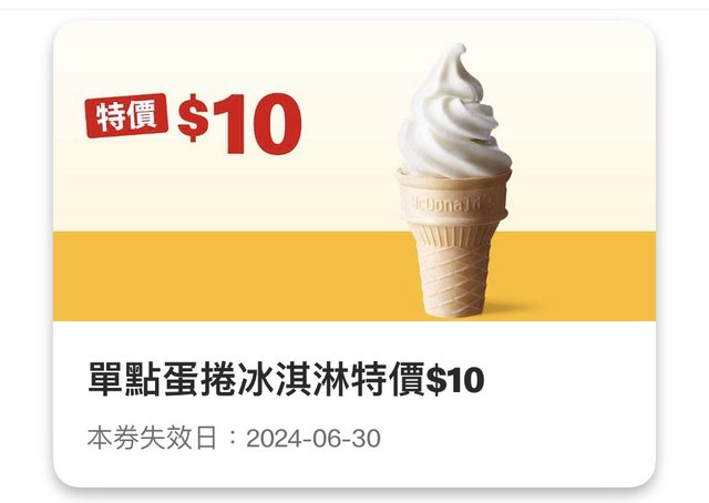 今天偶然開app看到,有10元蛋捲冰跟50元小玉米湯&小薯組合。 https://i.imgur.com/tKUwldg.jpeg