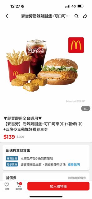 發文時可用 Ctrl+Y 刪除以下提醒 發文需要有省錢點。 勁辣雞腿堡+中薯+中可+四塊雞塊=139 原勁辣餐=140 等於少付1元又多了加點需要+49元的四塊麥克雞塊 https://i.imgur.com/UJDufzW.jpeg