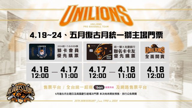▍4.19~24、五月復古月 統一獅主場門票預售 ▍