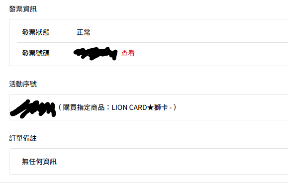 → OoZapoO: 我的獅卡訂單發票資訊下方 只有訂單備註 就沒有其他的了 06/10 21:15