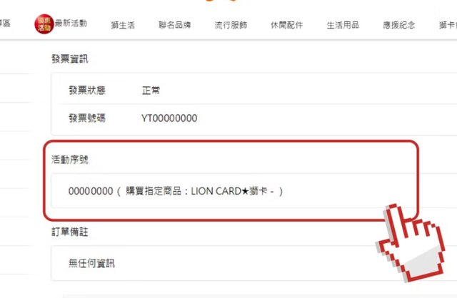 推 wheatty: 獅卡的那個訂單,發票資訊下方有活動序號 06/10 21:11