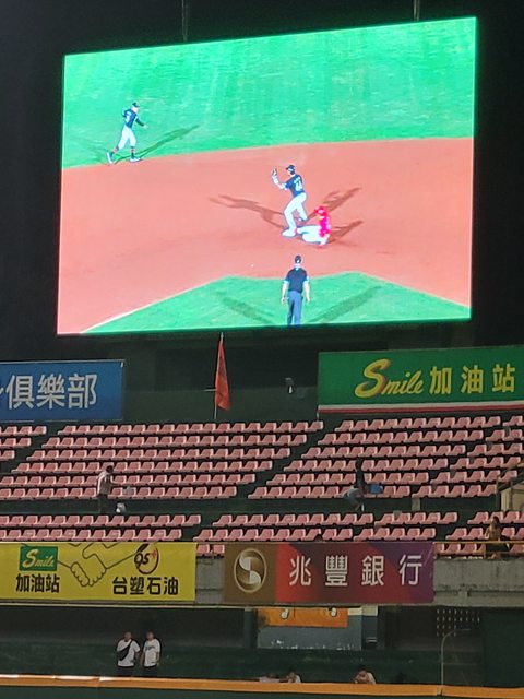 擊成場地規則二壘安打 壘上的蘇爸也毫無疑問的回到本壘