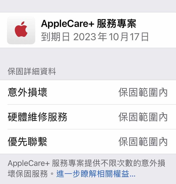 AppleCare+保固至2023/10/17