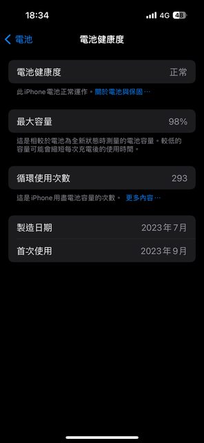 電池健康度98,循環次數293,已裝保護殼貼,外觀無傷無送修紀錄