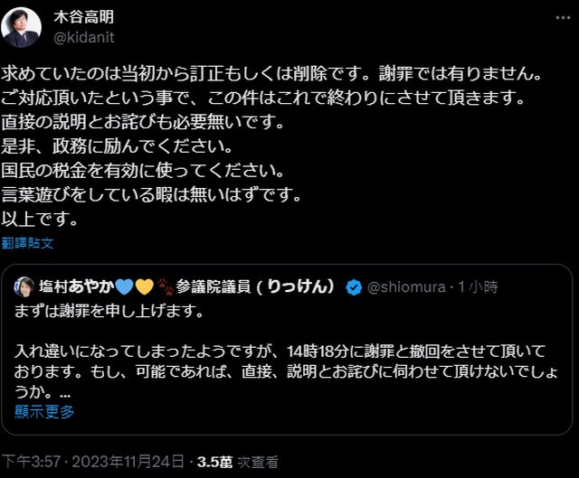 議員剛剛說希望當面跟木谷道歉