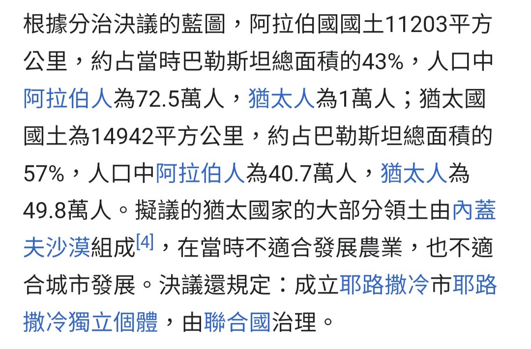 → sanae0307 : 其他給猶太人,猶太人分到的一堆都是內蓋夫沙漠 10/13 22:10