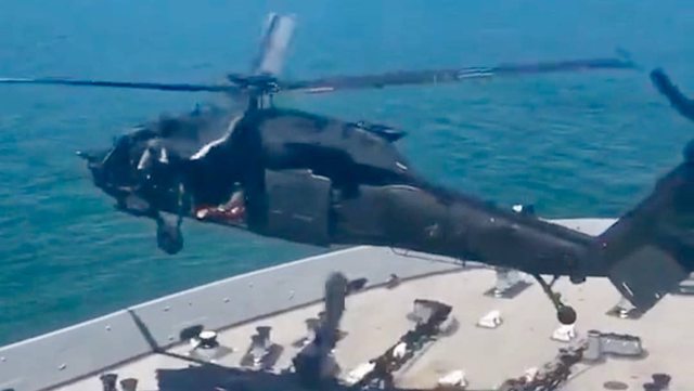 模擬透過快速繩索部署部隊或用機槍射擊艦橋然後飛走