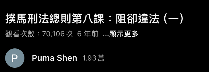 推 zivking : Puma 6年前在油管的刑法課完全都免費的呦 11/15 21:47