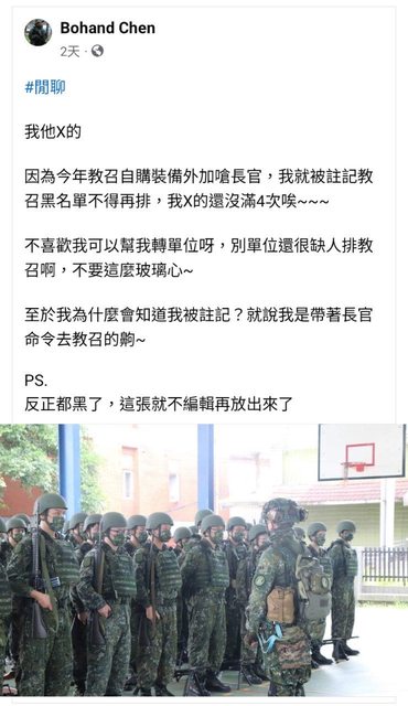 推 sober921 : 唬爛的吧,教召視同軍人是不怕被辦喔? 11/23 12:56