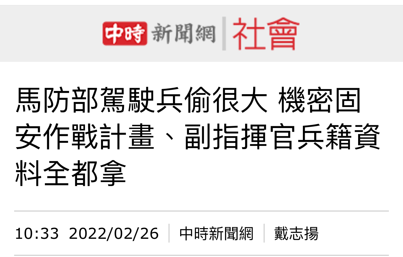 → jobli : 陸軍澎湖防衛指揮部蔡姓上士被控竊取作戰計畫等「極 12/12 15:24