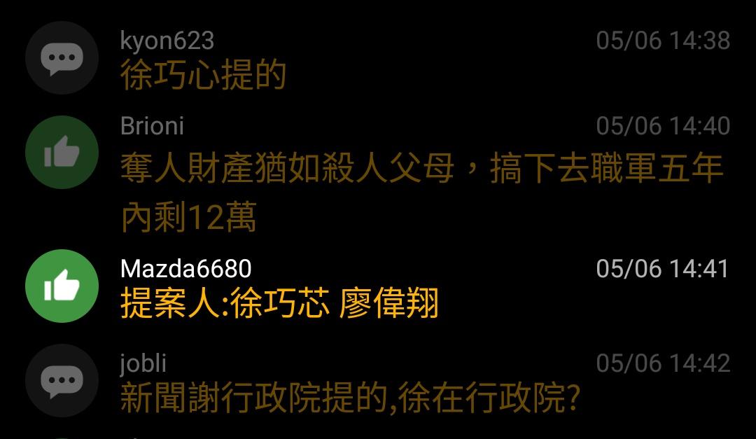 → jobli : 我等馬自達給我這個法案是徐巧芯提案,行政院跟國防 05/06 15:59