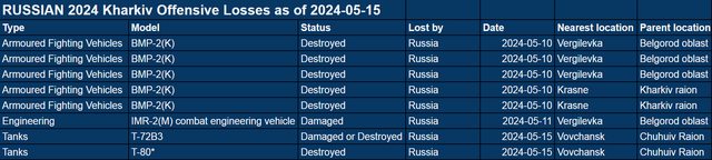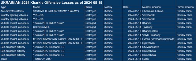 截至 2024 年 5 月 15 日已確認的進攻裝備損失