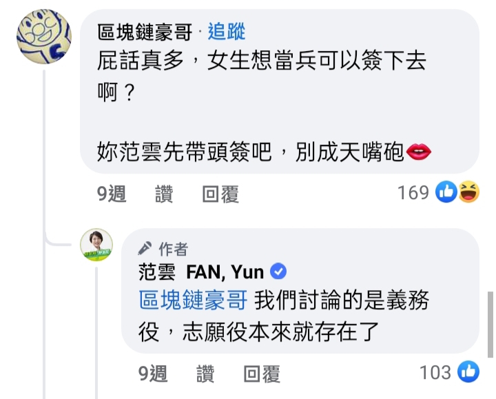 推 kimo21801 : 台女:人家是女森欸,為什麼需要當兵保護國軍 05/23 20:25