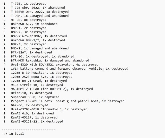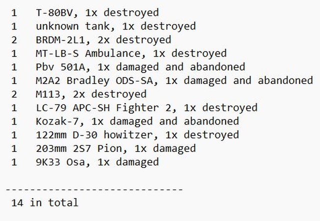 (3輛被摧毀,1輛被損壞)、1輛BMP、