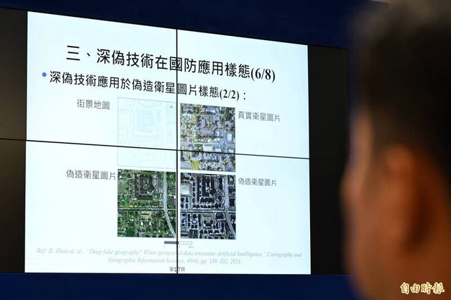 國防部召開「深偽技術簡介及國防應用樣態」記者會,舉例示範深偽技術偽造衛星地圖。