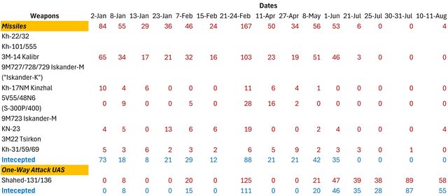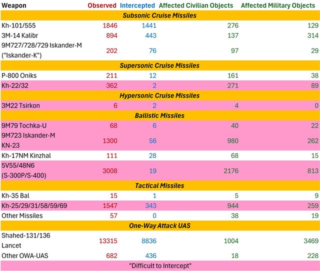 已在烏克蘭上空發射了 9,627 枚飛彈