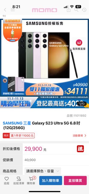 ※ 引述《cherry0000 (桃兒)》之銘言: : 這次雙11在momo看上一台三星的S23 Ultra : 折扣完不到3W,比平時還要省很多,想趁這次優惠買台新手機給老爸 : 因為他跟我媽退休後很常出國玩 : 又看到這支號稱手機界的單眼,廣角支援2億畫素相機,感覺適合他 : https://i.imgur.com/u7XVp56.jpg