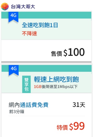 → ruye : 要用網路時,可以買99元/31天低速吃到飽。 11/27 17:02