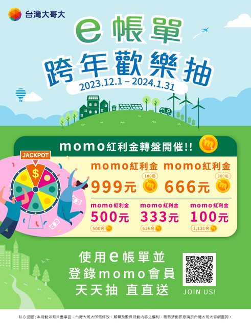 抽獎資格:e帳單用戶於活動期間2023/12/1~2024/1/31 (依台灣大哥大最新公告為準),