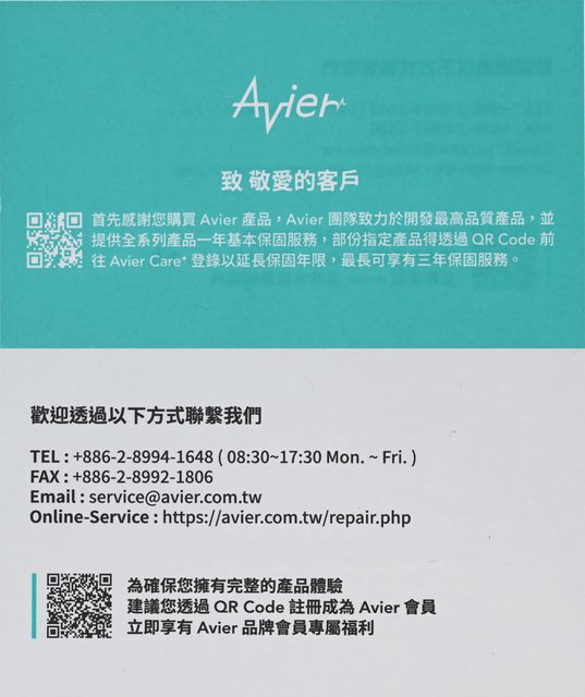 ▼包裝背面有產品規格、進口/委製商資訊、批次/生產日期、條碼、Avier CARE保固電子