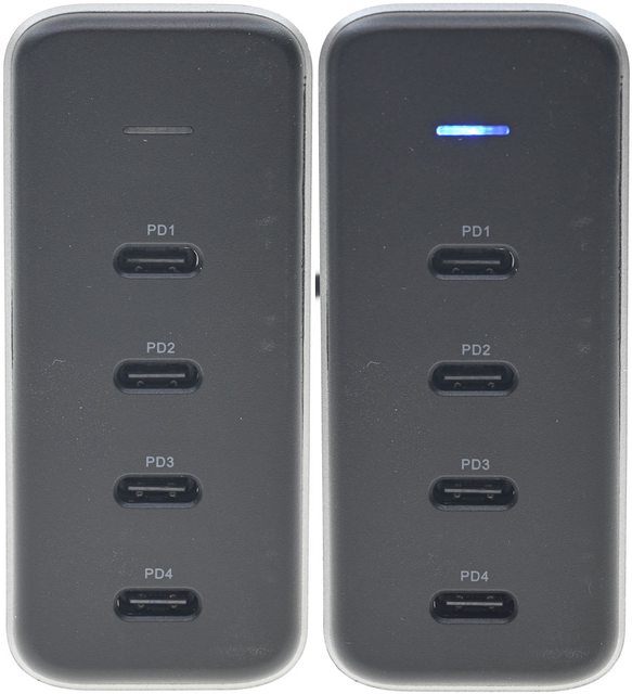 ▼本體黑色部分外殼有指示燈及4個USB-C埠,輸出埠標示PD1(C1)、PD2(C2)、PD3(C3)、