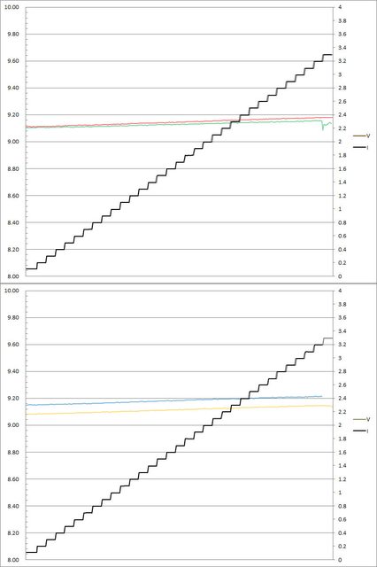 ▼C1(紅)/C2(綠)/C3(藍)/C4(黃)搭配5A線材的固定檔9V輸出負載測試,隨著電流增加,