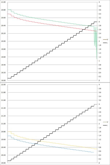 ▼C1(紅)/C2(綠)/C3(藍)/C4(黃)搭配3A線材的PPS檔21V輸出負載測試,隨著電流增加,