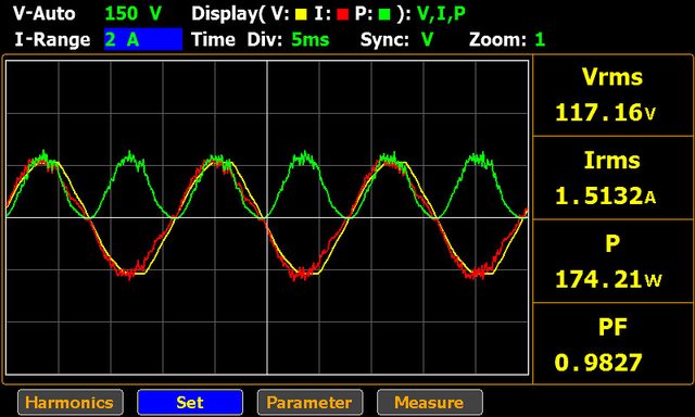 ▼USB-C1輸出100W,USB-C2輸出60W的輸入交流電壓/電流/功率波形如下圖所示,此時功